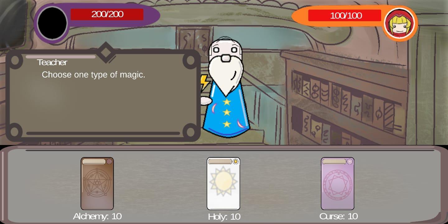Characters use three basic magic to attack: Alchemy, Holy Magic and Curse. Alchemy defeats Holy Magic, Holy Magic defeats Curse and Curse defeats Alchemy. It follows the basic rules of “Scissor, Paper, Stone”. When HP of player becomes 0, game over.